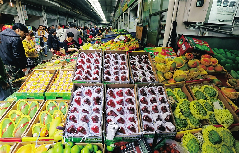 2月5日,在海口南北水果市场,人们正在购买水果。据悉,春节前后,全省水果需求量增加,春节期间水果日交易量曾一度达到4000吨以上。南北水果市场不忘把住“安全关”,食药监部门在现场设立食品安全驻场检测点,实现全天候驻场检测及监控,全力保障群众“舌尖上的安全”。 本报记者 张杰 摄