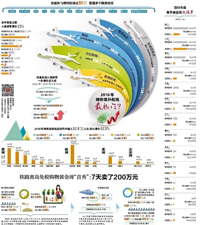 据介绍,为推动与有关国家互联互通,助力海南参与“一带一路”建设,我省制定了包括航线开通在内的对外交往计划,并通过省级领导出访予以推动,同时整合和调整有关民航客运财政补贴政策条款等,促进境外航线开通。本着“航线开通到哪,促销做到哪”的宣传理念,我省先后赴多个国家和地区举行专项促销活动,以巩固新航线航班,形成稳定客流,进一步发展海南入境旅游。境外航线增加带来境外游客人气的增高,数据显示,三亚凤凰国际机场完成国际及地区航班起降5188架次,同比增长77.3%,旅客吞吐量46.9万人次,同比增长88.6%,其中,香港航线最为热门。在2016年国际游客大幅增长的基础上,鸡年春节期间入境旅游市场也在实现持续增长。作为知名的国际旅游城市,春节黄金周,三亚进港国际旅客0.69万人次,同比增长94%。