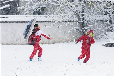 2月8日,在江苏省淮安市盱眙县淮河记事园,两名孩子在雪中玩耍。受冷空气影响,从2月7日起,全国多地陆续出现降雪天气。 新华社发