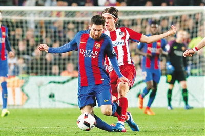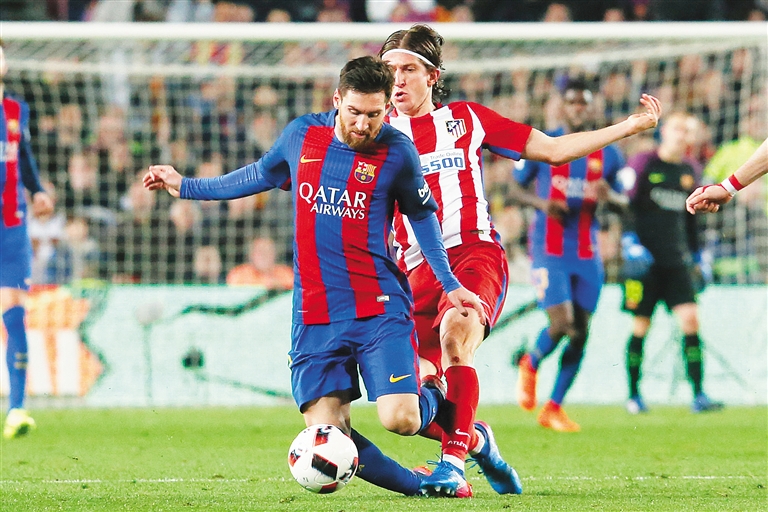 图为梅西(前)与马竞队菲利佩拼抢。 新华社发