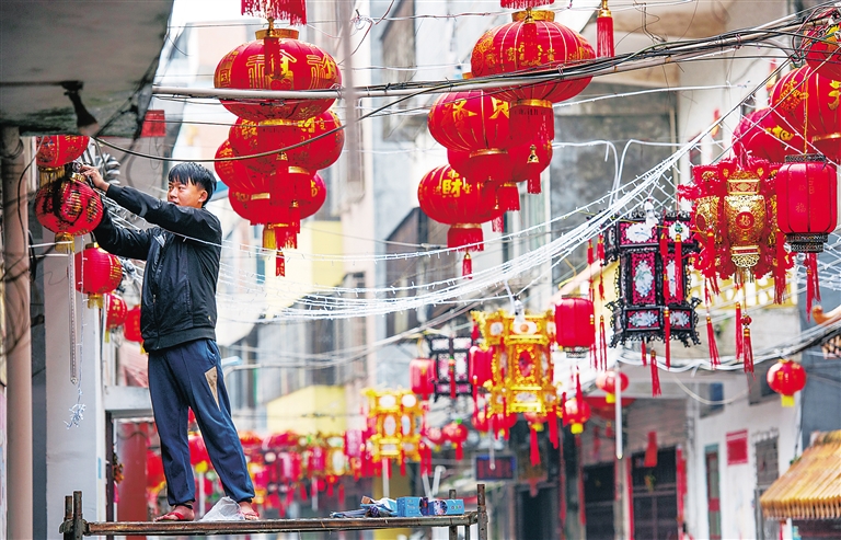 2月8日,海口市琼山区府城老街道绣衣坊,工作人员在加紧挂置灯笼。据了解,今年灯笼采用的是节能灯,使用的材质具有防水等功能,可以避免漏电现象发生,保障元宵期间市民游玩安全。 本报记者 张茂 通讯员 龙泉 摄