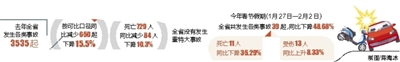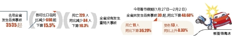 另据了解,今年春节假期(1月27日—2月2日),全省共发生各类事故39起,死亡11人,受伤13人。与去年同期相比,事故起数减少37起,下降48.68%,死亡(失踪)人数减少6人,下降35.29%,受伤人数增加1人,上升8.33%。其中道路交通死亡事故10起,死亡11人,受伤13人;火灾事故29起,无人员伤亡。