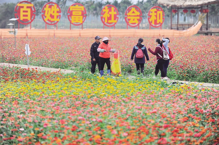2月11日,琼海嘉积镇龙寿村,贫困户王梅川和李丰和在龙寿洋花海打工,每天工资为100元。据了解,花海基地由两家农民专业合作社共同经营,通过“基地+合作社+贫困户”帮扶模式,已使31名贫困户脱贫。本报记者 袁琛 摄