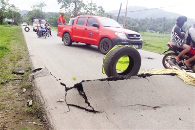这是2月11日在菲律宾棉兰老岛东北部城市苏里高拍摄的震后受损的道路。 菲律宾南部地区10日晚发生6.7级地震,目前已造成15人死亡、90多人受伤。 新华社/路透