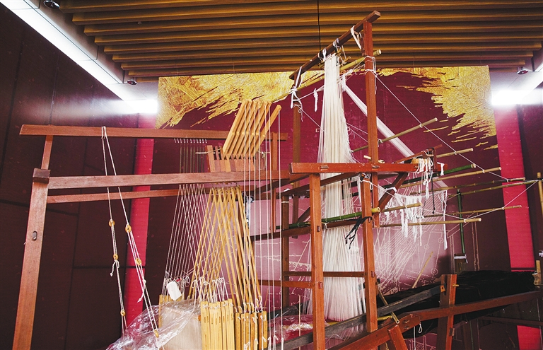 除了精彩的展品,一部足有4米高的云锦织机陈列在展厅外,织机需要两位工人协同工作,繁多的部件足以见得其工艺的复杂程度。工人在织云锦时一旦织错,就要从头来过,这样的难度为其“寸锦寸金”再添珍贵。