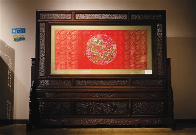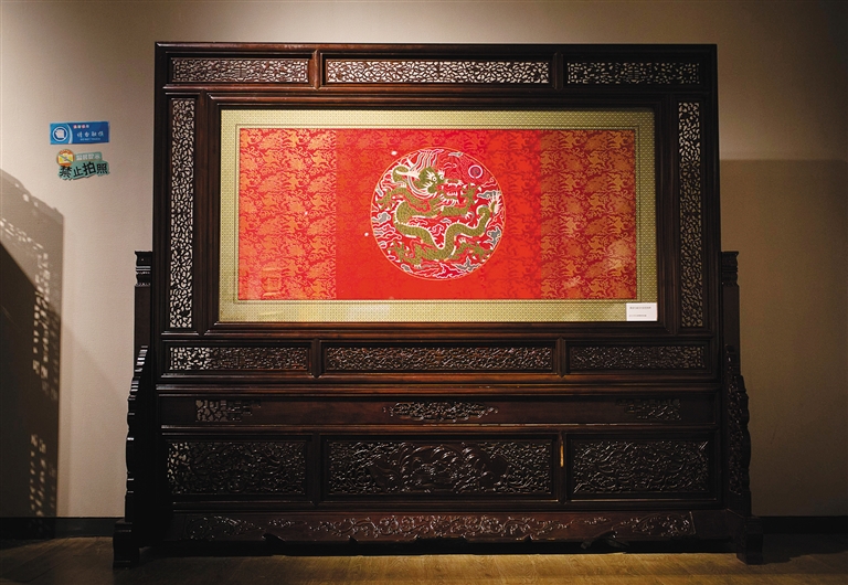 走进展览正门,首先映入眼帘的是一件清朝的“蓝地官用妆花纱蟒袍”。蟒袍上绣的“蟒”比“龙”要少一趾,在明代是皇帝对有功之臣的恩赐,到清代时逐渐放宽了限制,成为文武百官的礼服。库缎、库锦和妆花是云锦主要的三大花色。“妆花”是云锦中织造工艺最复杂的品种,也是最具有南京地方特色的提花丝织品种。金文在其《南京云锦》一书中介绍道,其工艺特点是通过挖花盘织,把各种彩色花纬,按纹样织入锦缎。