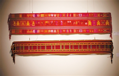 此次展览最大的亮点无疑就是将南京云锦与海南黎锦联合展出。没有金丝线的锦上添“金”,没有王公贵族的披挂上身,源自海南黎族的黎锦虽少了些“富贵气”,但却以其古朴素雅突显原生态之美。在观赏展览时,两种织锦以图案、色彩等展开“互动”,很是让参观者体会到“本是同根生”的无形力量。