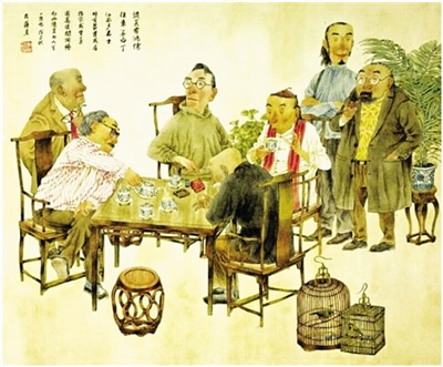 请看,环抱双臂有环抱双臂的架势,手握烟斗有手握烟斗的规范,至于夹香烟者的器宇轩昂,擦眼镜者的厚道持重,还有那尖唇啜出碧螺春味道的腔调,都是传神三分的。最好玩者当然是跷二郎腿给画中寿星续茶人,那坐姿,那手型,抿嘴不出一言却尽得风流!