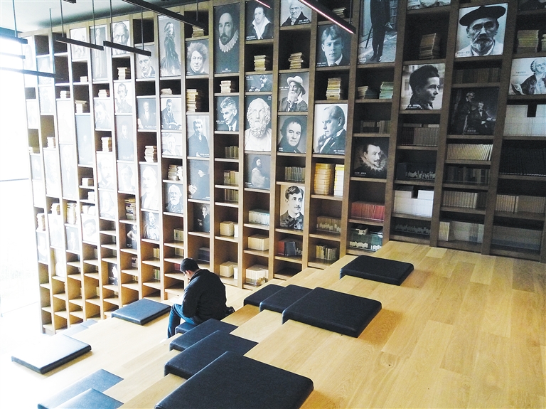 木心美术馆还有一间阶梯阅览室,一面墙的大书柜,里面装满了书,有木心的作品,有《文学回忆录》提到的作家们的作品。每节台阶放有垫子,脱鞋而入,席地而坐,便可在向阳的落地窗前开始一段“悦读之旅”。