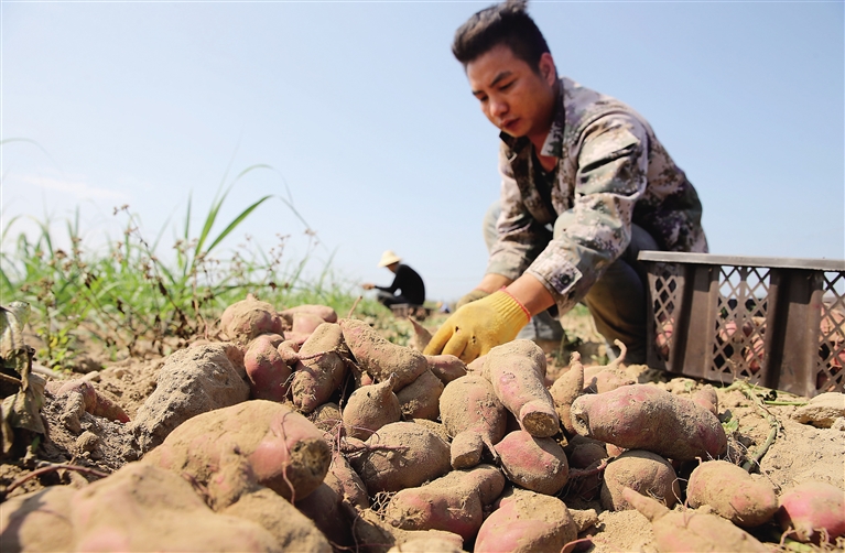 据介绍,海南绿翠生态环境股份有限公司采取“龙头企业+合作社+农户”模式,种植海头地瓜1400亩。政府、公司向周边贫困户免费提供种苗、肥料及技术,并统一按合同价收购。自2016年底海头地瓜上市以来,已从农民手中收购30万斤地瓜。本报记者 苏晓杰 摄