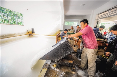 海胶龙江分公司茶山8队收胶站,正在称量胶工刚割的橡胶。据了解,海南农垦通过建设核心胶园提高单位亩产,减少成本亏损,龙江分公司2016年生产国有干胶11621吨,超过当年计划量2049吨,盈利大幅提高。本报记者 袁琛 摄