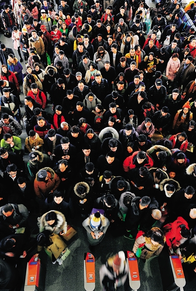 2月12日,旅客在江苏无锡火车站自助检票口排队进站。 元宵节过后,各地迎来节后第二轮铁路返程客流高峰。 新华社发(还月亮 摄)