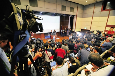 2月19日,在马来西亚吉隆坡,副总警长拉希德(中左)在新闻发布会上通报警方所掌握的情况。 当日,马来西亚警方举行朝鲜人死亡事件发生以来的首场新闻发布会。警方说,尚未确认13日在马身亡朝鲜人的死亡原因,其身份依然需要家属提供DNA样本加以确认。 新华社发(张纹综摄)