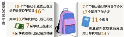截至2016年底,全省引进和洽谈合作办学项目46个、对口帮扶项目24个,覆盖了11个市县,北京大学附中附小、清华大学附中、北师大附中、人大附中、华东师大二附中、华中师大一附中等知名学校相继来琼办学,引进了一批高层次的优秀校长、教师和管理团队,对提升当地中小学办学水平的示范引领作用初步显现。