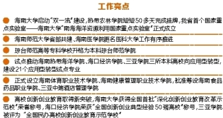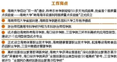 去年,我省出台了《海南省统筹推进高水平大学和一流学科建设实施方案》《海南省十二大重点产业人才培养的五年行动计划》《关于推动本科高校向应用型转变的实施意见》等系列重要文件,着力建立省重点产业“1对1”产教合作创新人才培养联盟,搭建供需双方沟通平台,提高专业设置、课程设置与社会需求的适应性,同时成立了海南省互联网、电子商务、酒店管理等人才培养创新联盟;以我省六大类产业园区为重点,推动职业院校与每个成规模的产业园区一体化办学,促使职业教育与产业发展有机互动、融合发展;将省重点产业人才联合培养纳入我省与江苏、天津、上海、福建等省市,与清华大学、北京大学、中国海洋大学等高校和国内知名企业合作的内容,进一步落实人才联合培养的具体承担院校和具体专业。