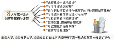 为应对高考综合改革带来的挑战,主动做好进入高考综合改革的相关准备,省教育厅在组织申报和充分论证的基础上,共安排研究经费115万元,于2016年4月正式启动了8大类16个高考综合制度改革相关课题研究,同时有39所普通高中学校作为实验样本校参与课题研究和实验,为2017年启动的高考综合改革探路并积累经验。同时,投入经费120万元,在海南中学等6所高中开展了高考信息化平台建设试点工作。