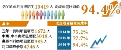 2016年,这些试点项目共完成招生10419人,完成年度计划的94.4%。7个试点项目中,5个项目完成率较2015年有所提高,提高较为显著的是中高职“3+2”分段培养项目,完成率为91.9%,比2015年提高了44.8%。