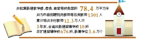 2014年—2016年,在改薄项目建设上,落实全面改薄专项资金32.9亿元,其中统筹中央资金17.9亿元,省财资金8.6亿元,市县资金6.4亿元。在教师队伍建设上,投入6.8亿元,主要用于农村特岗教师工资、乡村教师补助、教师周转房建设、教师引进和教师培养培训等。投入约6亿元,用于中小学教育信息化建设。