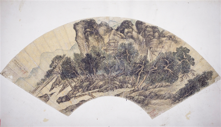 文征明的扇面《溪山楼阁图》虽已略显斑驳,但以细腻笔触勾勒的苍翠松柏、山涧溪流仍能让人感受到那个时代的文人雅致。