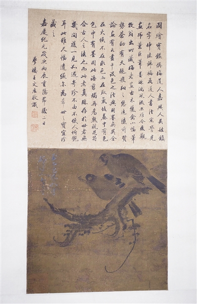 一幅元代的《寒柯双鸟图》绘制在泛着金色的绢面之上,颇有特色的是,这幅作品之上是清代嘉庆年间某位文人雅士的题字,上方的清代字与下方的元代画合裱在了一幅立轴之内。