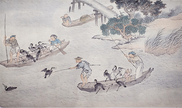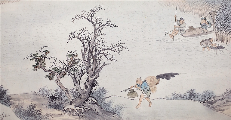 但即便如此,这些字画中仍不乏精品,属国家一级文物。戴着手套,陈睿小心翼翼地徐徐展开一幅巨作——清代吕学所画的《渔乐图》,随风摆动的芦苇荡旁,河边嬉戏的孩童,浅滩处用鱼篓捕鱼的渔民,晃荡的小渔船上正在捕鱼的渔夫,还有停落在船舷上的只只鱼鹰……精妙的画功让画面中的每一片树叶、每一个人物都活灵活现。这幅总长9.2米、画心部分长达6.4米的《渔乐图》通过描绘河岸边人们的各种劳作场景,将一个“乐”字表现得淋漓尽致,画中江南水乡的景致引人入胜。
