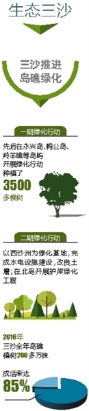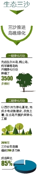 去年被确定为三沙绿化年,三沙岛礁植树200多万株,成活率达85%。三沙市还在全国首创了“互联网+”树木认养的运营模式,搭建“美丽三沙”微信公众服务平台,两批1500株树苗得到全国各地人士的迅速抢认,社会反响强烈。