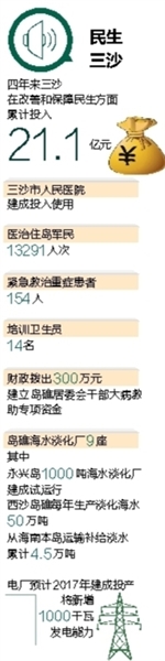 三沙始终把改善和保障民生作为工作之重,下最大的力气和功夫,破解建设层次高、困难大、成本高、环节多等困难,4年累计投入21.2亿元,健全基础设施,与军民共享三沙发展的红利与成果。
