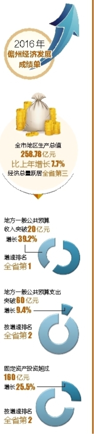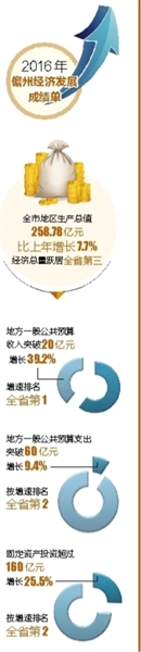 全市地区生产总值258.78亿元,比上年增长7.7%,经济总量跃居全省第三;地方一般公共预算收入突破20亿元,增长39.2%,增速排名全省第一;地方一般公共预算支出突破60亿元,增长9.4%,按增速排名全省第二;固定资产投资超过160亿元,增长25.5%,按增速排名全省第二。