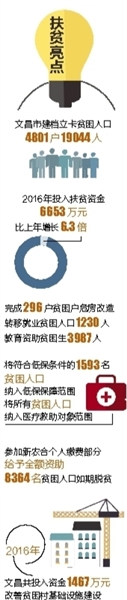 在具体的实施过程中,文昌按照“三年攻坚脱贫、两年巩固提升”的工作计划,通过实施劳务输出扶贫,产业扶贫激活造血功能,“教育+文化”扶贫助力拔穷根,改善贫困户住房条件,保障贫困老年人、残疾人基本生活,落实社会保障兜底,大力开展电子商务和金融扶贫,通过卫生健康脱贫等帮扶贫困户。据了解,文昌市2016年投入扶贫资金6653万元,比上年增长6.3倍。文昌着力解决“两不愁、三保障”问题,完成296户贫困户危房改造,转移就业贫困人口1230人,教育资助贫困生3987人,将符合低保条件的1593名贫困人口纳入低保保障范围,将所有贫困人口纳入医疗救助对象范围,参加新农合个人缴费部分给予全额资助,8364名贫困人口如期脱贫,文教镇加美村和东阁镇凤头村实现整村脱贫,超额完成省下达的脱贫任务。