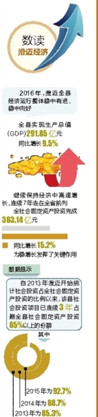 据了解,2016年,澄迈全县经济运行整体稳中有进、稳中向好:全县实现生产总值(GDP)291.85亿元,同比增长9.5%,继续保持经济中高速增长,连续7年走在全省前列;全社会固定资产投资完成363.14亿元,同比增长15.2%,为稳增长发挥了关键作用。