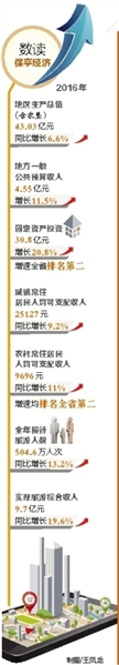 经济整体呈现增速平稳、结构优化、效益提升的良好态势,2016年地区生产总值(含农垦)43.03亿元,同比增长6.6%;地方一般公共预算收入4.55亿元,增长11.5%,;固定资产投资30.8亿元,增长20.8%,增速全省排名第二;城镇常住居民人均可支配收入25127元、农村常住居民人均可支配收入9696元,同比分别增长9.2%和11%,增速均排名全省第二;全年接待旅游人数504.6万人次,同比增长13.2%,实现旅游综合收入9.7亿元,同比增长19.6%;商品房销售总面积28.9万平方米,销售金额20亿元,分别增长47.6%和48%。