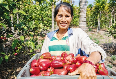 近日,在陵水黎族自治县兴罗果蔬种植基地,贫困户胡桂玉正在采收莲雾。