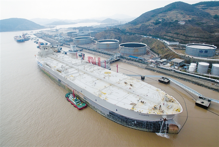 2月16日,超巨型原油轮“泰欧”号停泊在宁波舟山港大榭港区实华二期45万吨原油码头。当日下午,世界在航的最大载重吨级别船舶(超巨型原油轮)“泰欧”号在首次停泊宁波舟山港大榭港区实华二期45万吨原油码头完成卸油后离泊。 据了解,该轮船长380米,船宽68米,目前载重吨为41.9万吨。2月13日,装载33.96万吨原油的该船挂靠宁波舟山港大榭港区实华二期45万吨原油码头,创下挂靠宁波舟山港单艘油轮实际装载量最大的纪录。 新华社发
