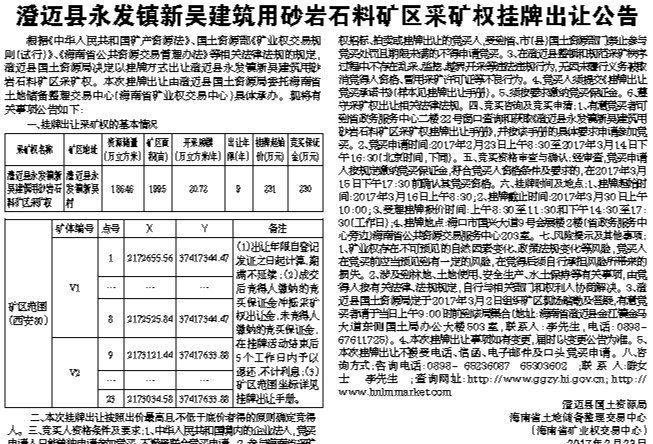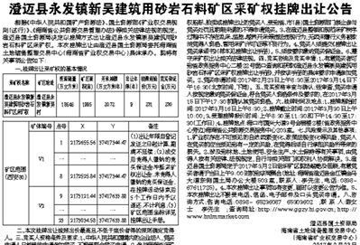 澄迈县永发镇新吴建筑用砂岩石料矿区采矿权挂牌出让公告