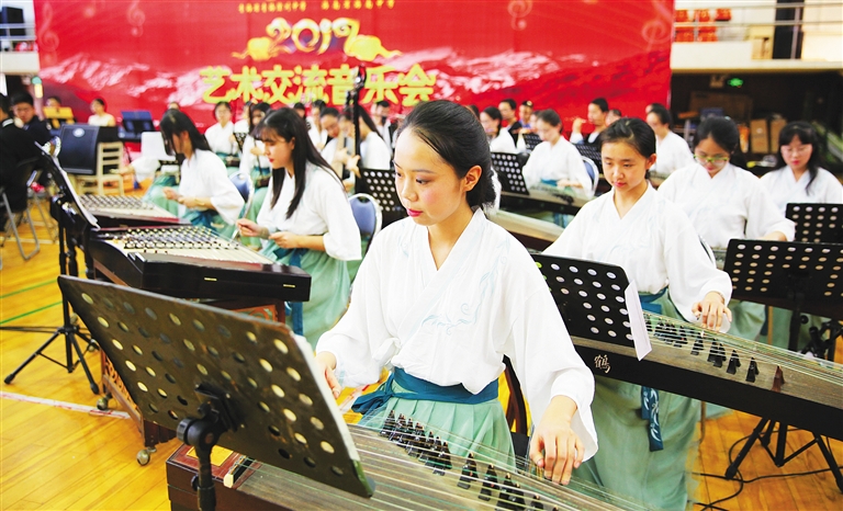 下午4时,海南中学体育馆看台上和赛场边上坐满了观众。青海湟川中学派出了本校江河之韵交响乐团、海湖之音民乐团两个乐团参加演出;海南中学派出了本校舞蹈团、合唱团两个团体参与表演。江河之韵交响乐团演奏的《北京喜讯到边寨》,以令人惊艳的交响乐演奏技巧,为两校艺术交流演出华彩开局。四五十人演奏的大乐团,身着燕尾服登台的指挥,气氛不亚于一场正规的交响乐音乐会,演奏更博得了现场观众的热烈掌声。其后,海湖之音民乐团演奏了经典中国民乐《喜洋洋》,海南中学舞蹈团表演了群舞《月光·丝路》,青海湟川中学两支乐团又一口气演奏了《多瑙河之波》《红楼梦》《康康舞曲》《赛马》四支中外经典乐曲,海南中学合唱团表演了海南民族特色浓郁的黎族民歌《赶鸟调》,海南中学舞蹈团献上了群舞《且吟春雨》,青海湟川中学两乐团又演奏了《匈牙利舞曲第五号》《茉莉花》《在那遥远的地方》《花儿与少年》《红色娘子军·万泉河水》,长达一个半小时的交流演出,最后在青海湟川中学江河之韵交响乐团演奏的《拉德斯基进行曲》的欢快旋律中落下帷幕。