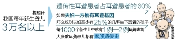 “我国耳聋人群体庞大,和其他国家一样,同症婚配即聋—聋婚配尤为常见。”符征说,同症婚配则使基因型耳聋患者婚配概率大大增加。如果夫妇一方携有耳聋基因,那么这对夫妇至少有25%的几率生下耳聋的孩子。