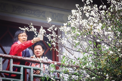 梅花小而娇嫩,却丝毫掩饰不住它的灵气,黄色的花蕊,晶莹剔透的花瓣,透出一种朴素的美,一种简洁的风情。百年古梅,枝干饱满、挺直、精神。特写、自拍、摆拍、轻触、细闻,长枪短炮、手机拍摄,人们不是在认真地观察梅花、就是在闻梅花的香味、或是在找角度留下合影。正月初七下午,记者在五公祠和琼台师院两个梅花盛开处看到这般热闹情景。当天,在五公祠、琼台师院两地,各有梅花盛开。只见花瓣白如银雪、层层展开;藏在中间的点点红蕊似羞红的脸,随风摇曳。在琼台师院“奎星楼”前,一树梅花素雅而立,远远望去,白色、绿色交织,清新淡雅;走进细看,裂皮老树上这一支、那一束梅花竞相绽放,散发勃勃生机。