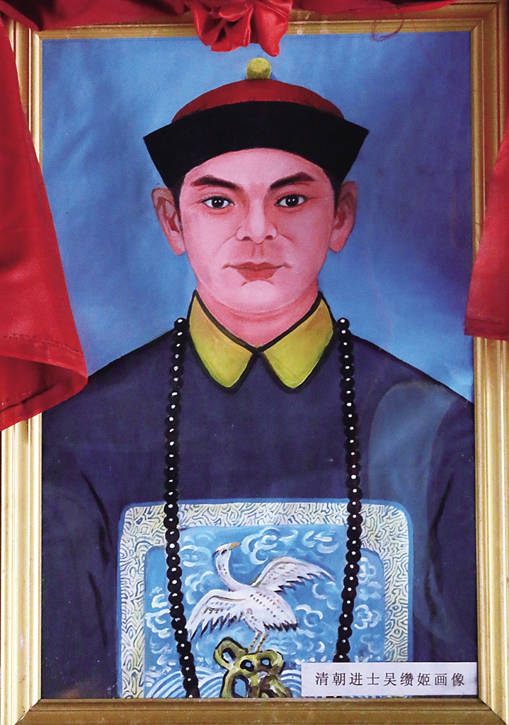 堂屋的墙上,挂着吴缵姬画像。一旁的简介里,记录了吴缵姬在学堂用“囊萤照读”的办法显露才智,别出心裁用蚂蚁玩“点兵遣将”时的聪明伶俐,以及中举之后写下“诸君何谓我偶然,因何偶然又偶然;诸君也可有偶然,因何诸君不偶然”的诗句,反击同学质疑时的意气风发。
