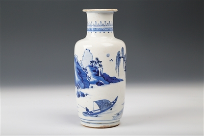 棒槌瓶因形似古时浣衣所用的木棒槌而得名,在康熙一朝最为流行。此件青花人物纹棒槌瓶为长直颈,肩部高耸,腹成筒形,圈足。瓷瓶的釉面呈白色,通体以青花为饰,颈部绘有一周齿状纹和菱格纹。腹部为主题图案,一面描绘的是一高士斜卧于柳、石之上,另一面则是一渔童立在舟中持竿垂钓,周围山石耸立,青竹翠柳环衬其间。