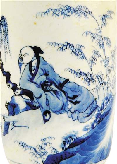 以青花为水墨在瓷胎上作画还有一妙处,因毛笔吸附的青花料饱含水分,笔触所到之处,必然出现渲染,文人画的笔墨讲究的便是神似。高士多是洒脱风流之人,悠然于山水之间,如何绘制其形态与山水之景至关重要。青花人物纹棒槌瓶中高士的面部和衣纹都不过是寥寥数笔,然后以青花涂染,雅拙生动,人物的风骨神情就已跃然纸上,并与身旁的青柳翠竹相映成趣。高士为主图,后面的山水作为人物的依托皆着墨不多,但构图和谐,以之表明人物的高雅志趣,也反映出康熙时期文人普遍的精神追求。