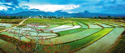 图为2月24日,昌江黎族自治县七叉镇七叉村1000多亩的大田洋一角。这里不仅是历年来高产稳产的良田,也是四方游客前来观赏木棉花和田园风光的好去处。 特约记者 吴文生 通讯员 薛盛智 摄