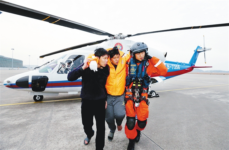 2月25日,获救船员(中)在救助人员的搀扶下走下飞机。 2月24日,“冀黄渔02698”船在浙江舟山外海沉没,船上约20人遇险。记者从中国海上搜救中心获悉,截至26日12时,其中7人获救,均无大碍,其余人员仍失联。现场搜救工作仍在紧张进行。 2月25日16时许,东海救助局直升机抵达“东海救117”轮船上空,把7名获救船员一一吊上飞机。经过一个多小时的飞行,直升机安全抵达普陀山机场。7人身体均无大碍,其中1人左脚受伤。 新华社发(华志波摄)