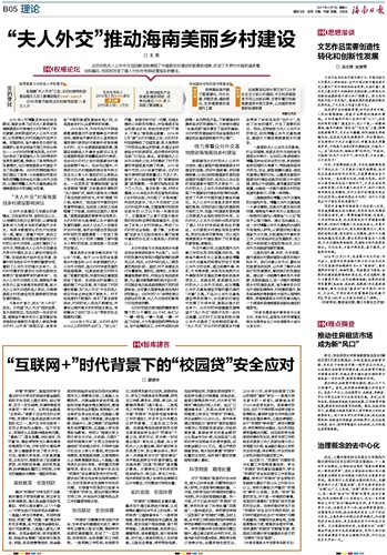 外交外事为民,这是我国外交外事工作的出发点和落脚点所在。海南省外事侨务办公室提出建设博鳌公共外交基地的构想目的在于发挥公共外交的优势,通过统筹外事、侨务、外专等资源,实实在在地把外交外事服务民生福祉的事落实到具体项目上。实践证明,彭丽媛在北仍村的夫人公共外交活动,成为博鳌公共外交基地建设历程的最闪亮的“点睛”之笔,不但为公共外交基地建设带来助推力,也在新农村建设中发挥了引领作用,展现出强大的生命力。北仍村的快速健康发展得益于“夫人外交”活动产生的一系列正能量,北仍村又为我省积极开展公共外交提供了生动鲜活的案例,“夫人外交”为北仍村的美丽乡村建设带来了实实在在的“生产力”,形成了良性的循环,产生了连锁的反应。因此,应持续放大夫人公共外交的效应,依托博鳌公共外交基地建设,继续大力推进海南美丽乡村建设。