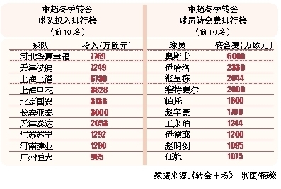 在俱乐部投入榜上,共有8家中国俱乐部进入全球冬季转会烧钱榜前20位。河北华夏幸福成为今年全球冬季转会烧钱最多的俱乐部,转会费投入7769万欧元。天津权健排名第2位,转会费投入7249万欧元。巴黎圣日尔曼排名第3位,转会费投入7000万欧元。上海上港排名第4位,转会费投入6730万欧元。上海申花排名第7位,转会费投入3828万欧元。北京国安排名第11位,转会费投入3138万欧元。长春亚泰以3000万欧元排名第12位。深圳佳兆业以2603万欧元排名第14位。天津泰达以2053万欧元排名第17位。