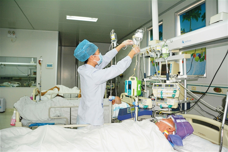 近日,在屯昌县人民医院宽敞明亮的ICU病房里,呼吸机、除颤仪和亚低温治疗仪等一排排专业医疗设备正在稳定运行,医护人员正专心地观察监控仪,准确记录下患者的各项生命体征监测结果和护理情况。