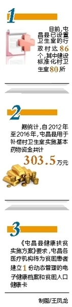 在提升服务的同时,屯昌不断降低基层医疗成本。全县具有基本医疗功能的村卫生室皆实施国家基本药物制度,所有药品均在全省统一的网上平台进行阳光采购,并取消药品加成,实行零差价销售。据统计,自2012年至2016年,该县用于补偿村卫生室实施基本药物资金共计303.5万元。