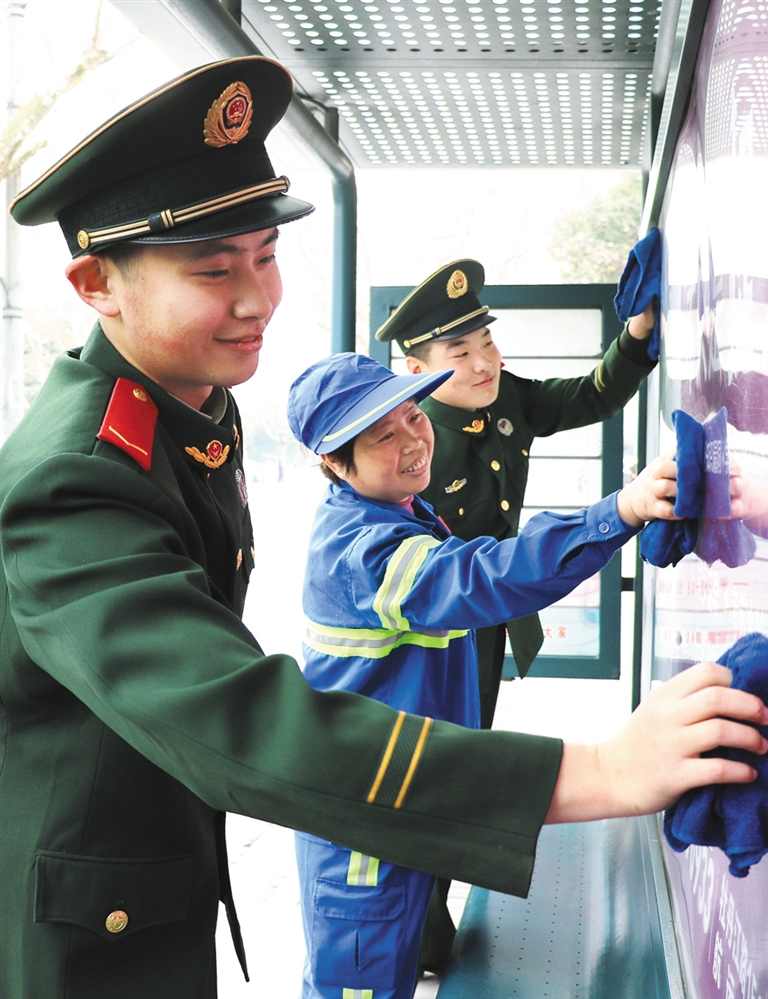 3月1日,武警上海总队七支队官兵和环卫职工一起清洁公交站台。 3月5日学雷锋日到来前夕,不少地方展开多种形式的学雷锋活动,以实际行动弘扬雷锋精神。 新华社记者 陈飞 摄