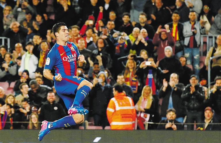 北京时间3月2日,在西甲第25轮比赛中,巴塞罗那在主场6:1狂胜希洪竞技。由于皇家马德里本轮3:3战平拉斯帕尔马斯,巴萨领先少赛一场的皇马1分,以57分登上西甲积分榜首。图为巴萨球员苏亚雷斯进球后庆祝。新华社发
