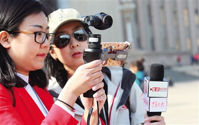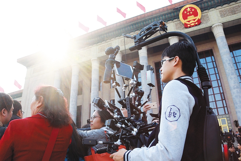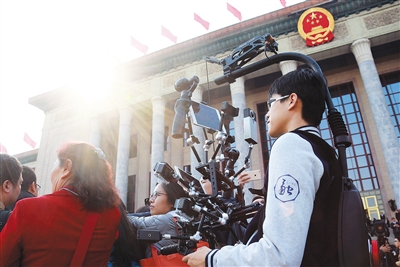 3月3日下午3时,全国第十二届五次会议在北京人民大会堂开幕。会场内外,各路媒体记者纷纷亮出采访“神器”,展开了一场高科技设备大PK。