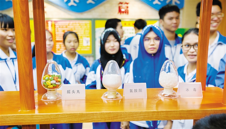 基地设在三亚市城郊检察院的五楼。当天,来自三亚市实验中学的学生走进这里。鲜活案例介绍、真实作案工具与毒品样本陈设、青少年犯罪电视报道……在检察院工作人员的讲解下,他们对警示教育知识表现出了极大的兴趣和好奇。“第一次看到这么全面鲜活的案例和工具展示,让我觉得挺震撼的。”高一女学生黎经渊说。